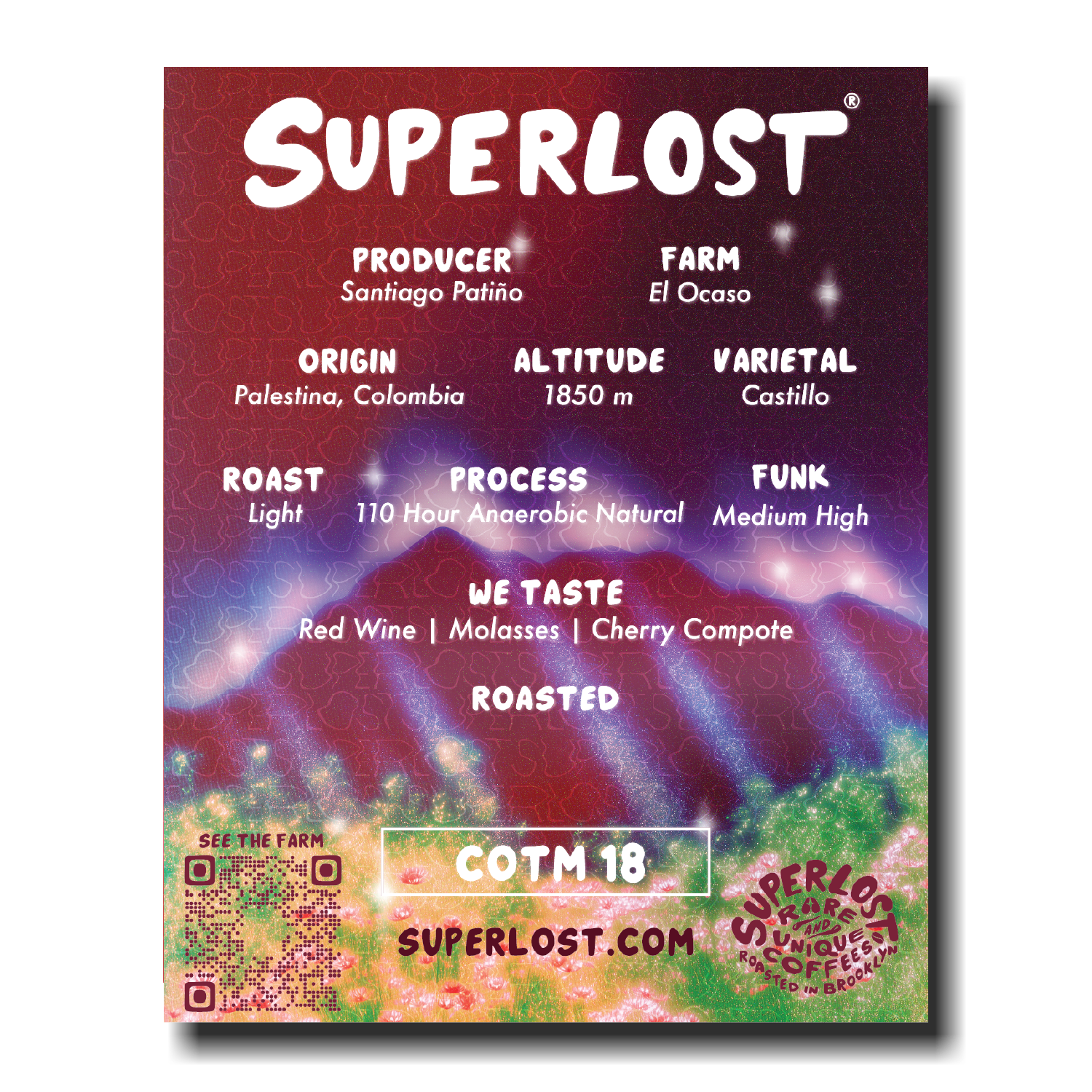 Shade grown and slow ripened, these cherries develop deep sweetness and layered complexity. It’s a bold, funky expression of place, passion, and process. This Castillo underwent a 110-hour anaerobic natural process, unlocking intense notes of red wine, molasses, and cherry compote.