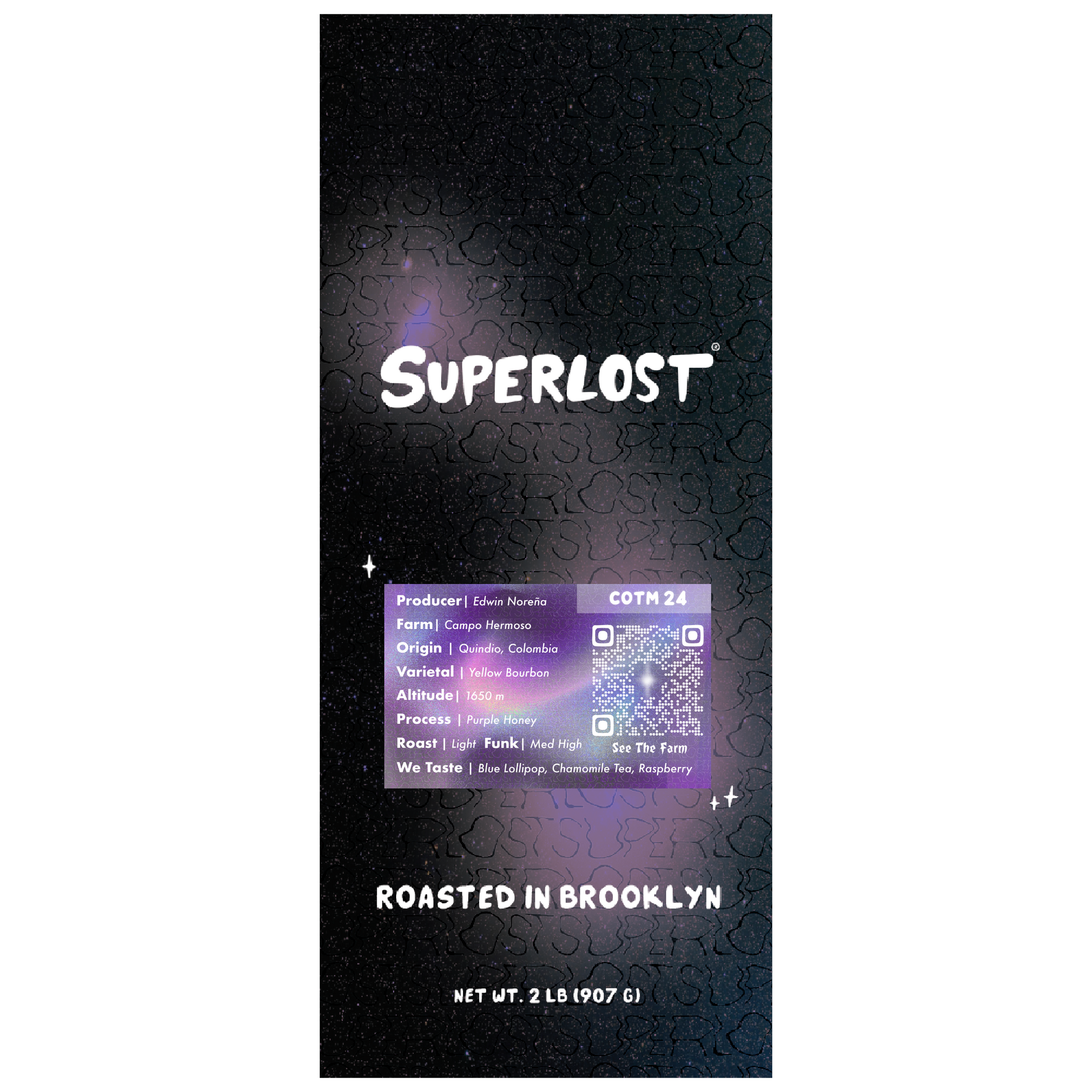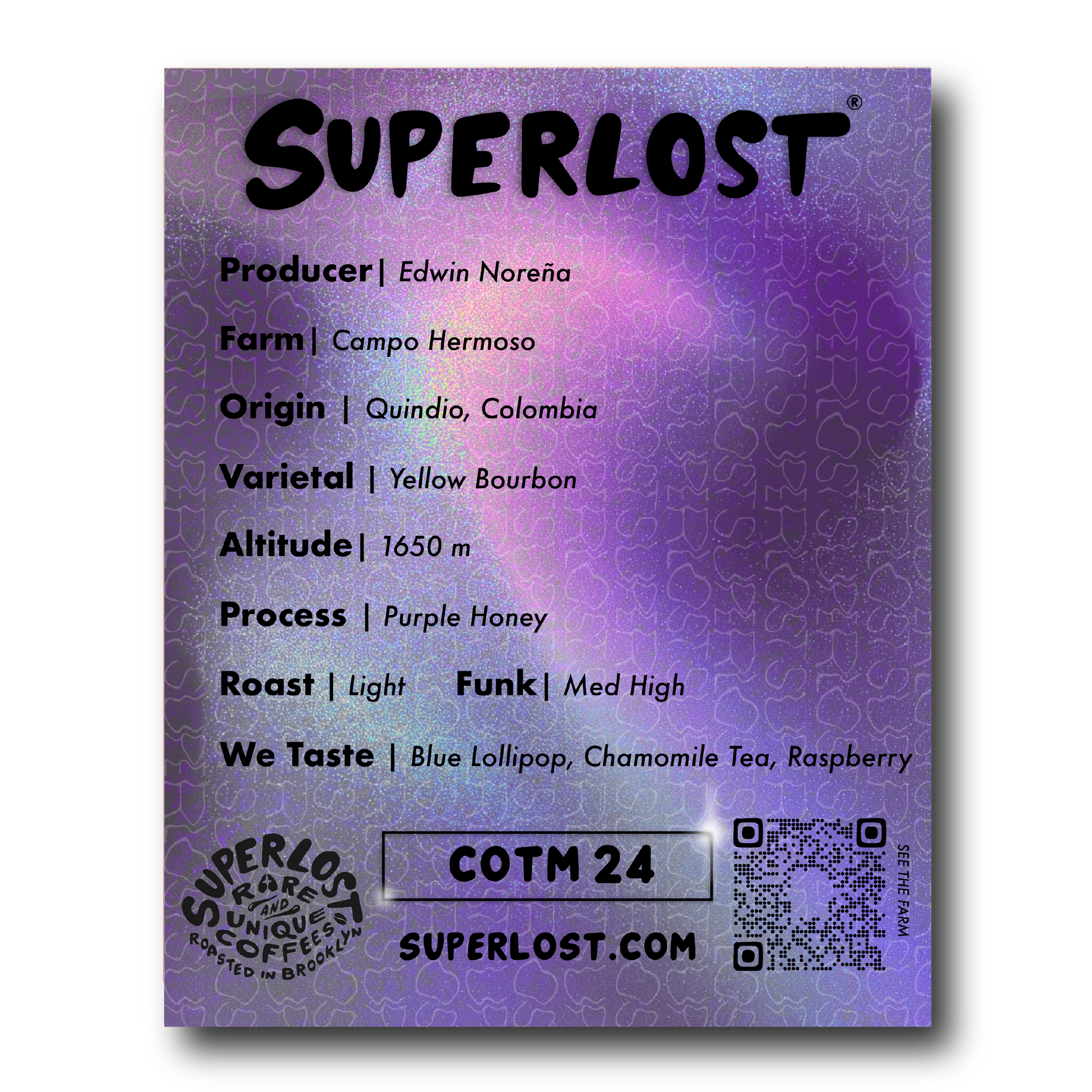 Edwin Norena’s Yellow Bourbon undergoes a purple honey carbonic maceration with mossto recirculation. The extended fermentation delivers a refined cup with floral body, balanced sweetness, and vibrant notes of blue lollipops, chamomile tea, and raspberries.